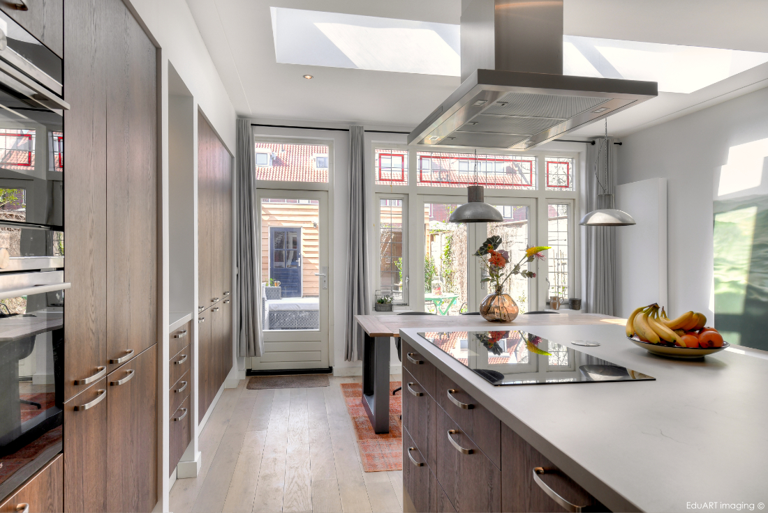 Er is hier gekozen om een aanbouw met woonkeuken te maken aan de achterzijde en in de stijl van de woning. Daarom is de aanbouw over de gehele breedte van de woning geplaatst. De aanbouw is opgetrokken uit metselwerk in een vergelijkbare baksteen. Het bestaande kozijn met tuindeuren en glas-in-lood uit de oude achtergevel is hergebruikt. Hierdoor is de stijl van de woning overgenomen in de aanbouw. Door in het dak een lichtstraat te plaatsen komt er extra daglicht binnen. Met die reden is ook de muur tussen de bestaande keuken en eetkamer weggebroken. De oude achtergevel is ook weggebroken. Hiervoor in de plaats is een constructief portaal gekomen. Samen met de aanbouw is er zo één grote ruimte ontstaan. Hierin ligt een grote keuken en eethoek met uitzicht op de tuin.